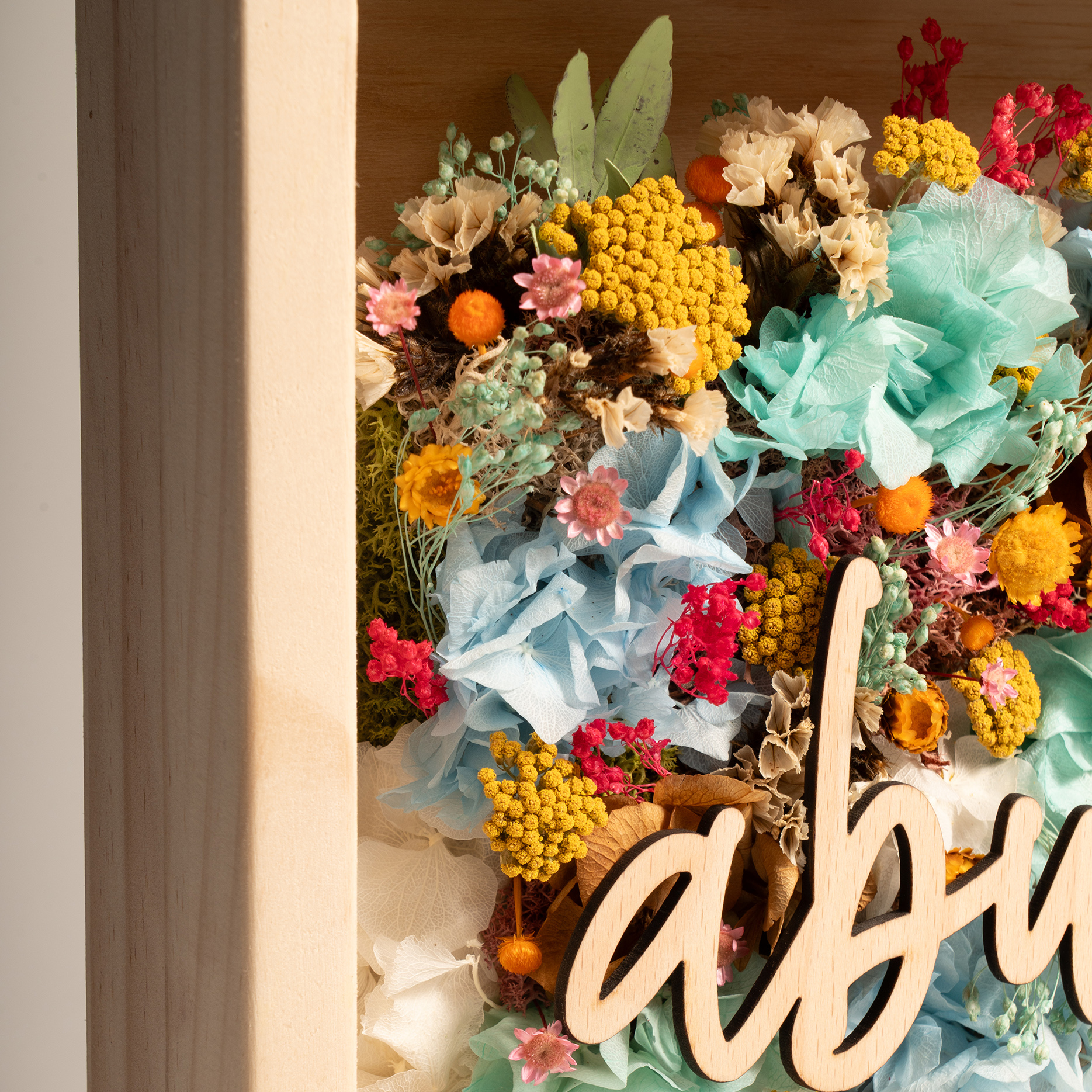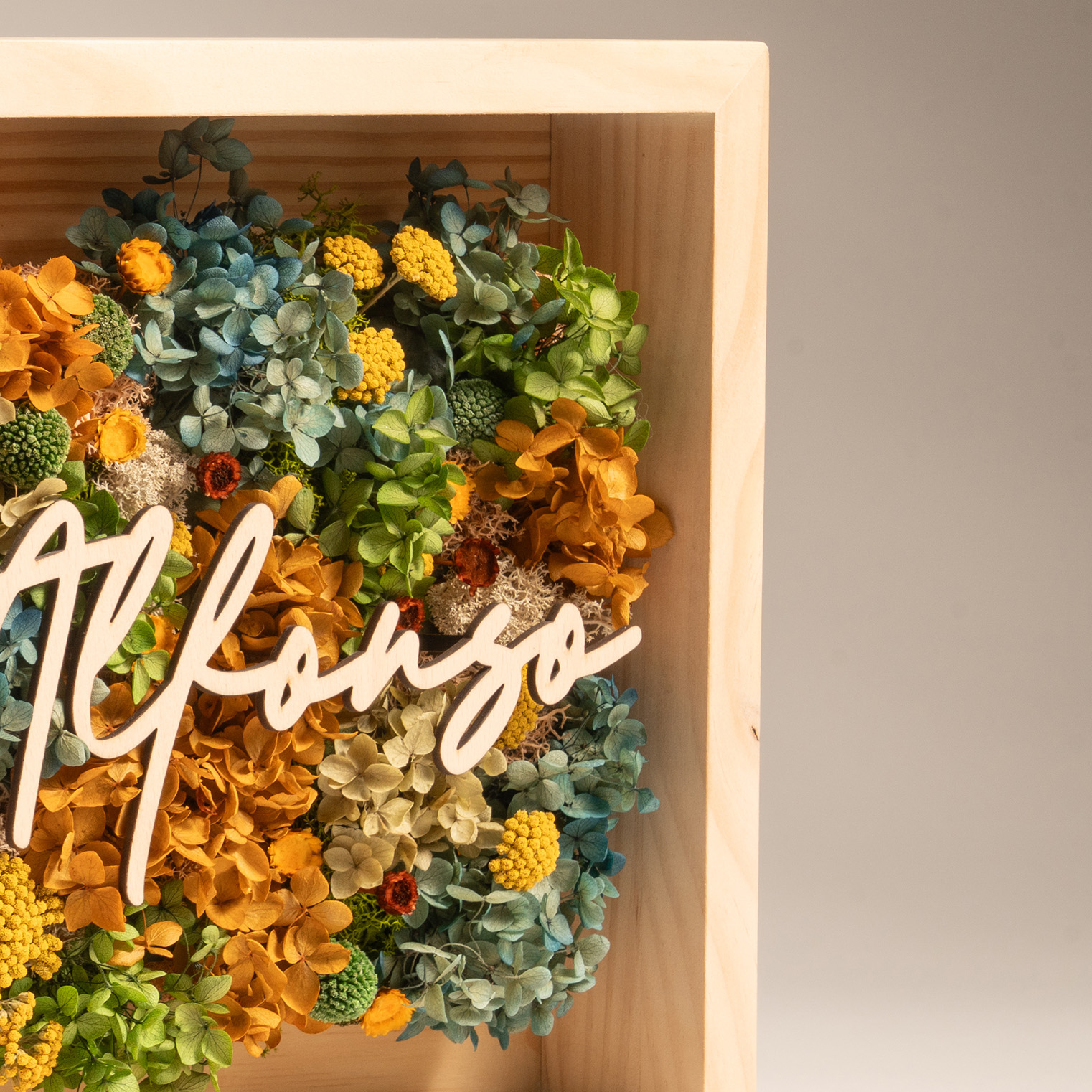 Factae Classic es un cuadro personalizado, con una palabra o nombre recortado en madera, y una composición floral con flores secas seleccionadas con precisión.